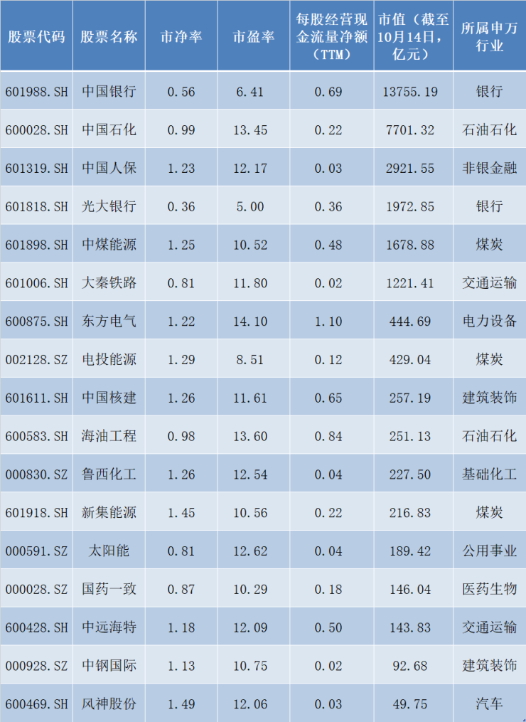 从近500家央企控股上市公司中,每经投研院首先剔除了近一年市盈率(TTM)为负或者近一年的每股经营现金流量净额(TTM)为负的公司,再从剩余的公司中,每经投研院筛选出了市净率小于1.5倍、市盈率小于15倍的公司,具体名单如下: