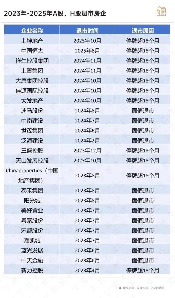 截至2025年10月27日A股共有12家房企退市,其中有8家房企集中在2023年退市。