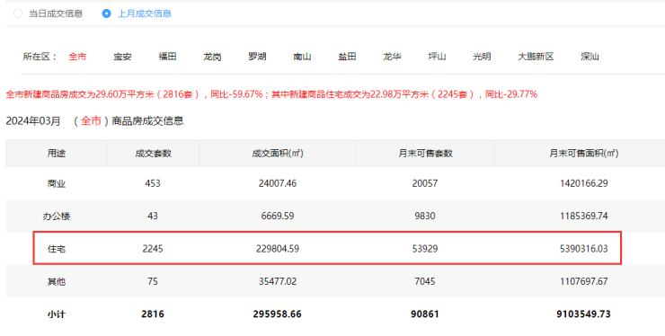 深圳房地产信息平台公示,3月深圳全市新建商品房成交为29.60万平方米(2816套),同比-59.67%;其中新建商品住宅成交为22.98万平方米(2245套),同比-29.77%。