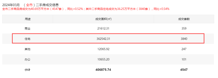 3月深圳全市二手商品房成交为40.69万平方米(4547套),同比+0.52%;其中二手商品住宅成交为36.25万平方米(3840套),同比+0.54%。