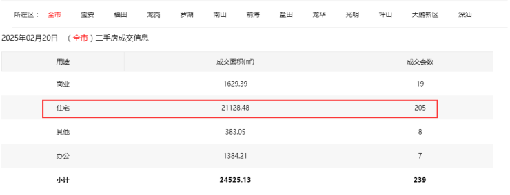 2025年2月20日二手房住宅网签205套。其中,宝安35套;福田25套;龙岗44套;罗湖30套;南山38套;盐田13套;龙华16套;坪山2套;光明1套;大鹏1套。