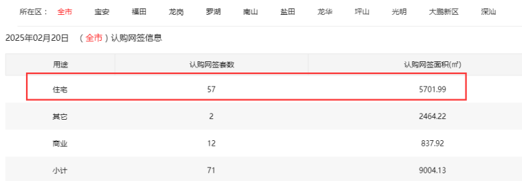 2025年2月20日新房住宅认购网签57套。其中,宝安11套;福田2套;龙岗23套;罗湖4套;南山1套;盐田0套;龙华10套;坪山4套;光明6套;大鹏0套;深汕0套。其中,宝安23套;福田0套;龙岗19套;罗…