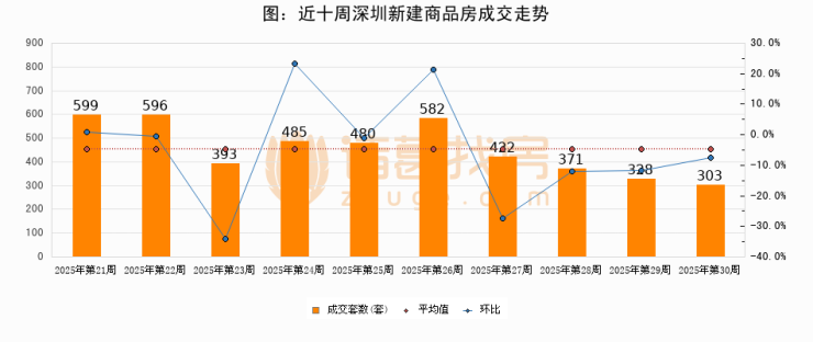 进入2025年第30周(07月21日-07月27日),深圳新建商品房成交303套,较上周减少25套,环比下降7.6%