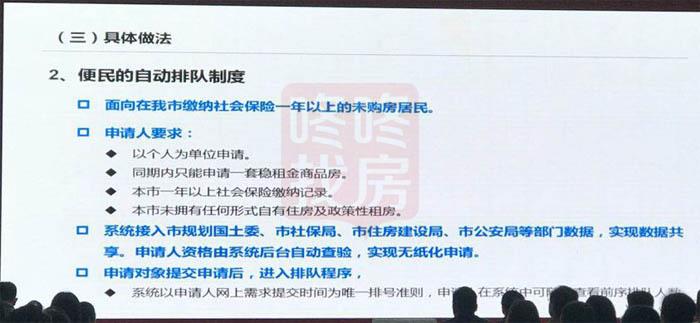 2、便民的自动排队制度。我们有面向对象的要求,即在我市缴纳社会保险一年以上的未购房居民,可以以个人为单位申请,同期内只能申请一套稳租金商品房,本市一年以上社保缴纳记录,本市未拥有审核形式自有住房及政策形成租房。系统接入规土委、社保局、住建局、公安局等部门数据,实现工具共享,申请人资格由系统后台自动查验,大家只需要输入身份证号,后台会自动查验你是否符合租房要求。申请提交后进入排队程序,以晚上提交时间为少有的排号准则,先到先得。