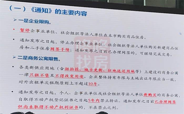 一是企业限购,暂停企事业单位、社会组织等法人单位在本市购买商品住房。通知发布之日起,停止办理企事业单位、社会组织等法人单位购买新建商品住房和二手住房网签手续,通知发布之日前已办理网签的,可继续完成交易。