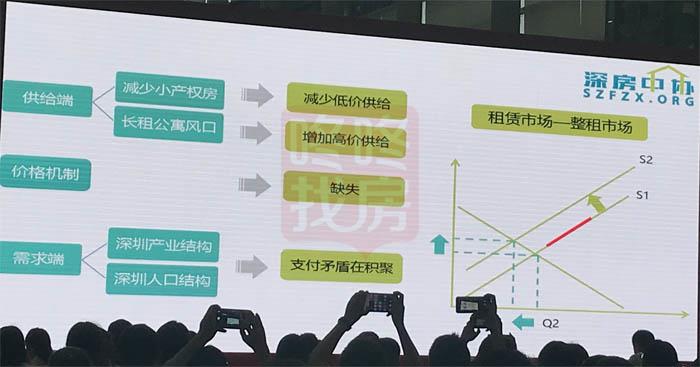 在各种限,限贷、限外、限购等政策的影响下,有效需求是下移的,过去深圳的交易量可能是20万套,现在真正能在深圳买房的人只有10万套,有效需求曲线下移,但供给曲线没有变,因为土地增长没有那么快,开发商的供应量不会放量,供给曲线是不会变动的,需求曲线下移的结果是交易量下行,量价齐跌的态势,这是我们对未来深圳市场的判断。