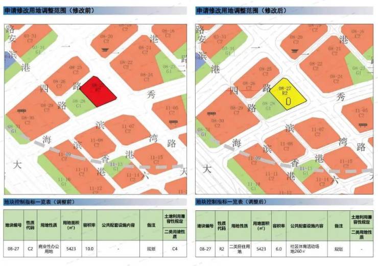 宝安中心区法定图则08-27地块,原用地性质为商业性办公用地,用地面积为5423平方米,容积率10.0。规划调整为二类居住用地,用地面积为5423平方米,容积率6.0,配建社区体育活动场地。