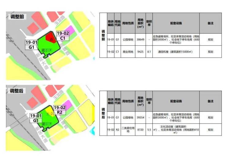 龙华新城核心地区(局部)修编法定图则19-02地块,原用地性质为商业用地,用地面积为9425平方米,容积率8.1,配建通信机楼。规划调整为二类居住用地,用地面积8720平方米,容积率5.5,配建文化活动室、社区体育活动场地。