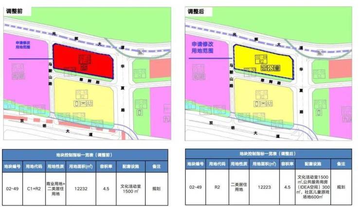 光明中心地区法定图则02-49地块,原用地性质为商业用地+二类居住用地,用地面积为12231平方米,容积率为4.5,配建文化活动室。扣除与现有权属用地冲突部分后,用地面积调整为12223平方米,二类居住用地,配建2处公共服务用房、1处社区儿童游戏场地。