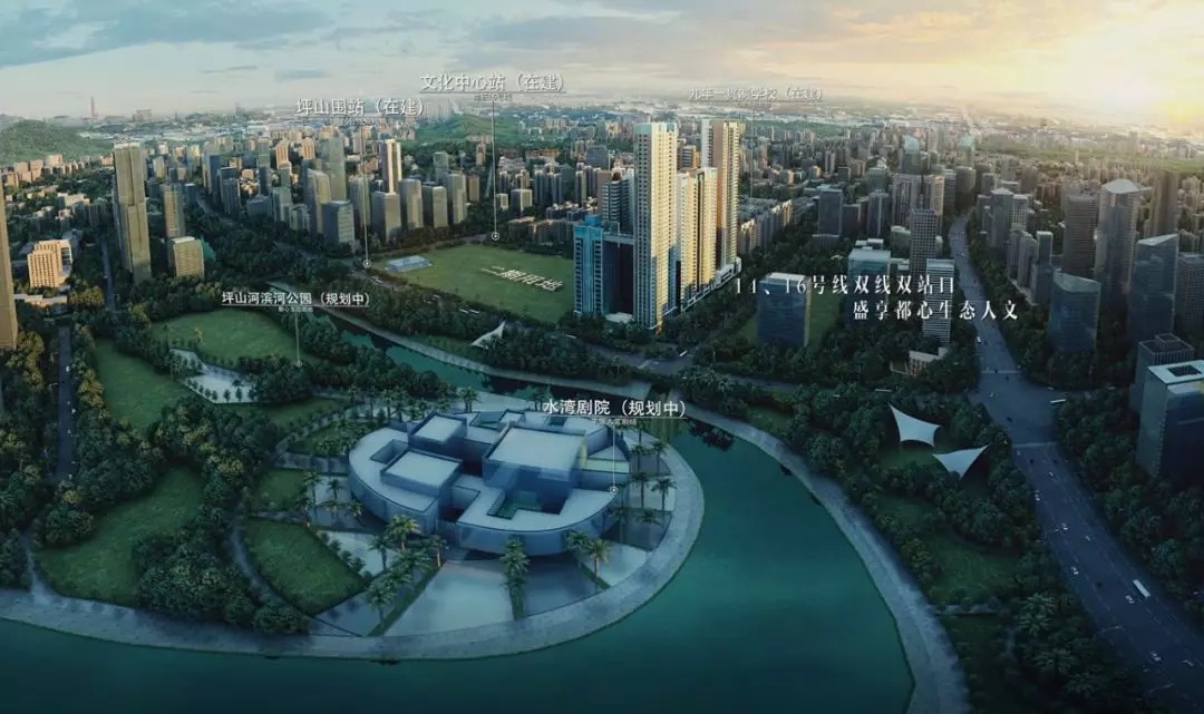 公共配套方面,六馆一城近在咫尺,规划中的水湾剧院与项目仅一路之隔;生态方面,享有坪山中心公园,规划旧改完成后将扩展为半月环绿廊公园与坪山河湿地公园两大绿地系统,休闲、运动就在家门口;教育配套方面,项目所属学区为坪山实验学校学区,坪山实验学校是坪山师资力量最强的学校。此外,项目西北侧在建中的恒大九年一贯制学校,政府投资6.5亿,将引进名校师资力量;商业方面,坪山益田假日与项目二期相距仅约百米,且项目配套了4.28万㎡商业含一期、二期,其中二期商业将与地铁坪山围站无缝连接;交通上,更是地铁14、16号线上盖,项目二期无缝接驳坪山围站,毗邻坪山围,文化中心站双地铁口。
