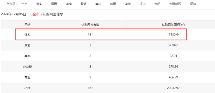 2024年12月5日新房住宅认购网签151套。其中,宝安50套;福田2套;龙岗17套;罗湖3套;南山16套;盐田6套;龙华14套;坪山21套;光明19套;大鹏3套;深汕0套。2024年12月5日新房购房合同网…