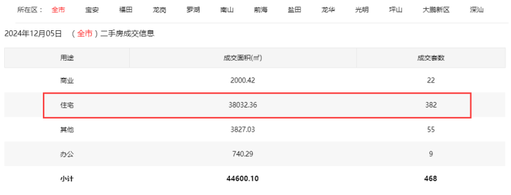2024年12月5日二手房住宅网签382套。其中,宝安52套;福田64套;龙岗92套;罗湖38套;南山64套;盐田8套;龙华44套;坪山10套;光明7套;大鹏3套。