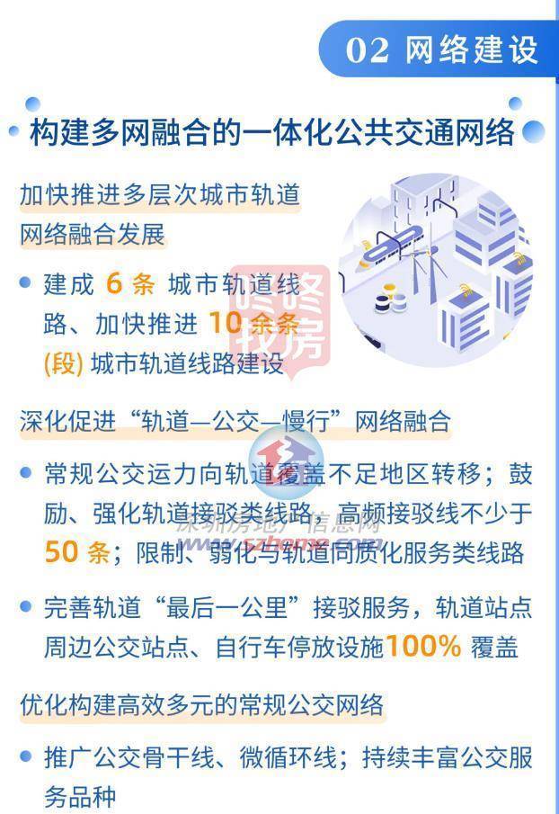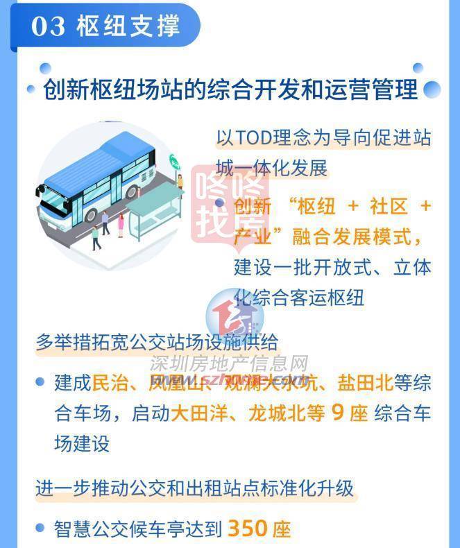 TOD理念为导向促进站城一体化发展,加大城市轨道交通枢纽上盖及周边保障住房建设力度,推进前海、岗厦北、黄木岗、大运、平湖、鹭湖、白坭坑、五和、光明城、梅林关等一批枢纽的站产城一体化开发;多举措拓宽公交站场设施供给;进一步推动公交和出租站点标准化升级。