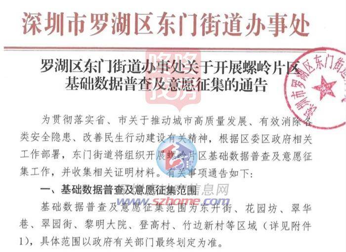 据【家在】网友@Wodamu爆料,近日,罗湖东门街道办开展螺岭片区基础数据普查及意愿征集的公告。