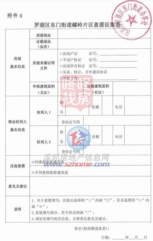 从罗湖区东门街道螺岭片区意愿征集表可以看到,需要登记房屋地址、证载地址、房源来源证明文件、申报建筑面积(有证、无证)、物业权利人基本信息、改造意愿(同意拆除新建改造或不同意拆除新建改造)等