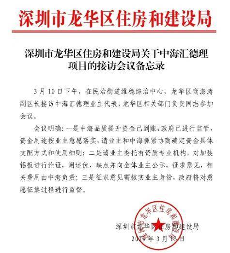 3月13日,据深圳市龙华区住建局发布的关于中海汇德理项目的接访会议备忘录显示。