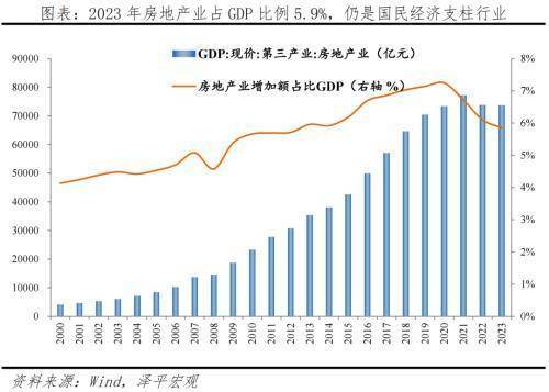 2023年房地产业增加值为7.4万亿元,占GDP的5.9%。自2003年以来,国务院18号文将房地产定位为支柱性产业。20年来,房地产成为我国经济发展火车头之一。2000-2023年我国房地产业占GDP比例由4.1%增加到5.9%,一般而言,在经济中占比超5%的行业可以成为经济的支柱产业。2023年,受房地产行业下行周期、房地产市场供求关系发生重大变化影响,房地产行业占GDP比例下调至5.9%,但仍与2014年水平持平。