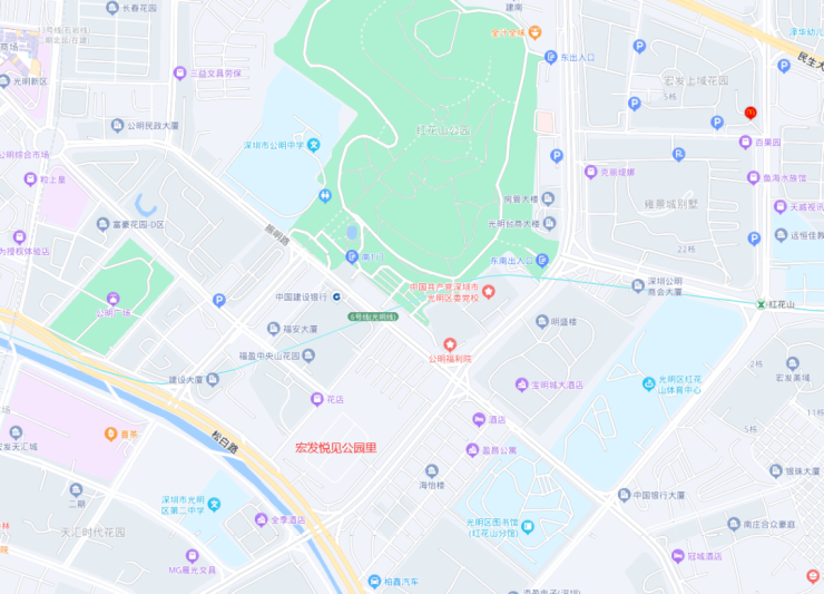 市政配套:周边市政配套已经发展的成熟,在宏发悦见公园里直线距离约500米范围内拥有光明区图书馆(红花山分馆)、红花山体育公园、红花山公园、公明广场等市政配套,业主学习、运动、休闲娱乐均在家门口可享。