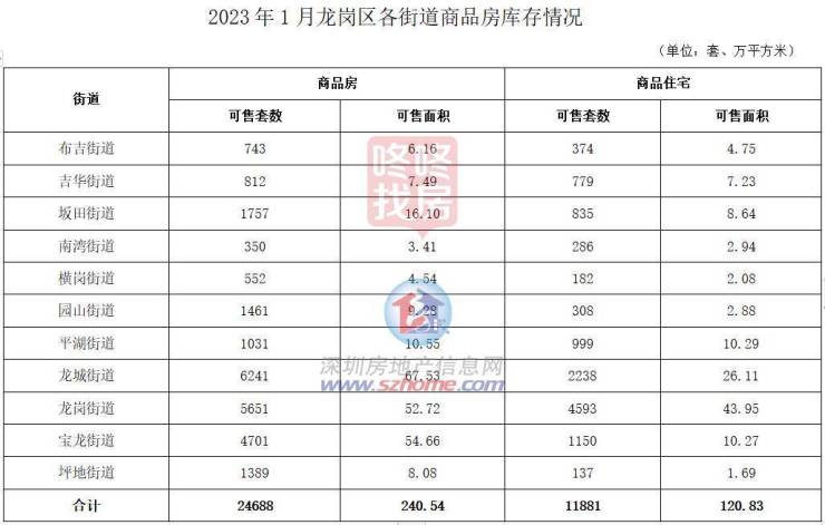 截至2023年1月末,龙岗区新建商品房在售项目库存面积为240.56万平方米,库存套数为24688套。其中,商品住宅在售项目库存面积为120.83万平方米,库存套数为11881套。