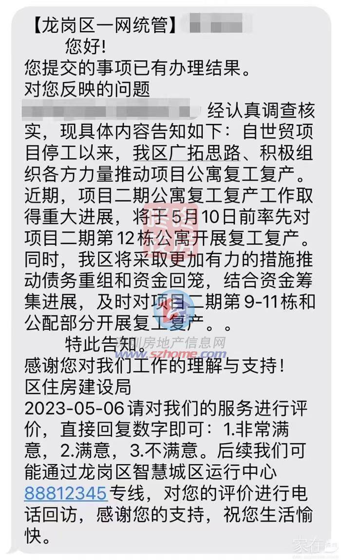 据网友爆料称,深圳世茂之都二期公寓将于5月10日复工,此次率先复工的是12栋。