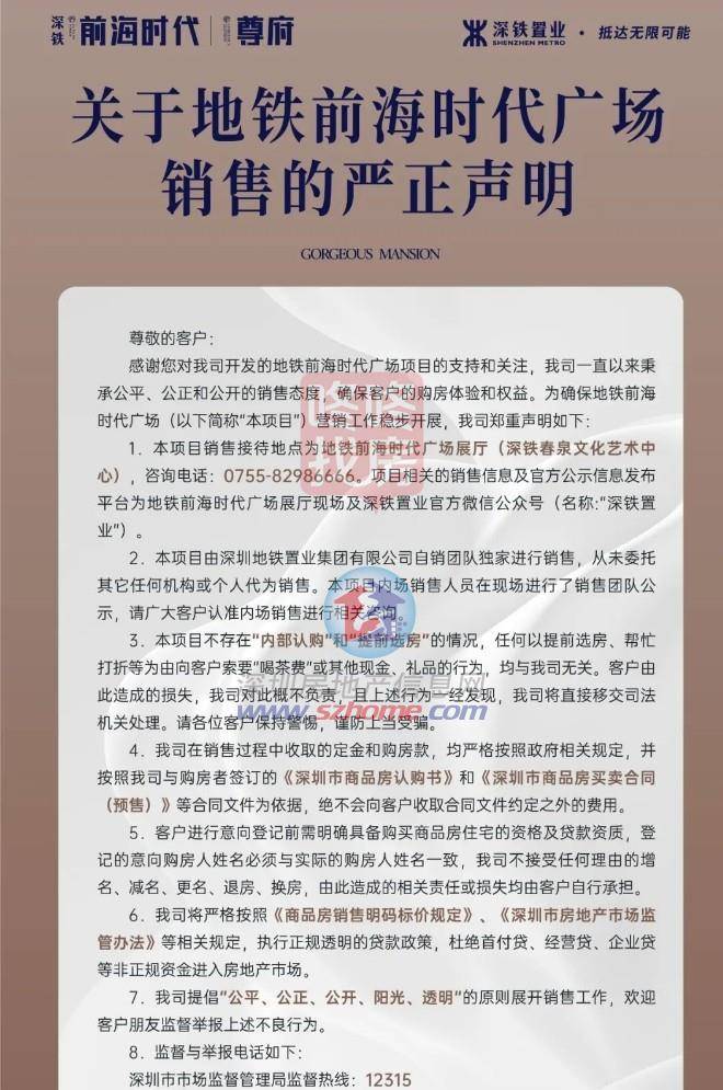 12月14日,深铁前海时代广场连续发出销售的严正声明和销售团队公示,表示无内部认购提前选房,公平、公开、公正进行销售等。