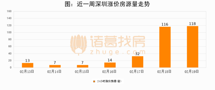 根据诸葛找房数据显示,深圳24小时涨价房源量为118套,较02月18日增加2套,环比上涨1.7%。与此同时,涨价房源占比小幅扩大,业主信心有所提升。