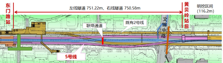 黄贝岭站后明挖段-东门路站区间(简称黄东区间)是深圳市轨道交通5号线工程(黄贝岭站后至大剧院段)第1段区间工程,区间双线总长约1500米。