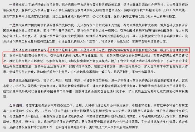 12月21日,据央行发布消息,人民银行行长易纲主持召开会议,其中提出,推动金融平稳健康运行。坚持房子是用来住的、不是用来炒的定位,因城施策实施好差别化住房信贷政策,满足行业合理融资需求,支持刚性和改善性住房需…