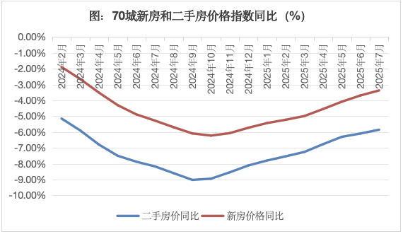 比如,一线城市二手房价领跌,且跌幅扩大。7月份,一线城市二手房价指数环比下跌1%,连续4个月下跌,且跌幅不断扩大,直逼24年“9.26”新政前的跌幅水平。