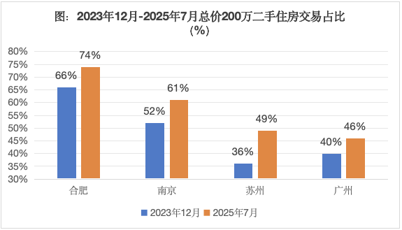 再比如,近期一二线城市“低总价、低单价”二手房交易占比上升,比如广州、南京、合肥等城市200万总价交易占比接近60%,比2023年上升了10个百分点,京沪300万总价以下交易占比接近50%,也上升了10个百分点。太原和佛山,二手房套均总价已经低至50万出头。