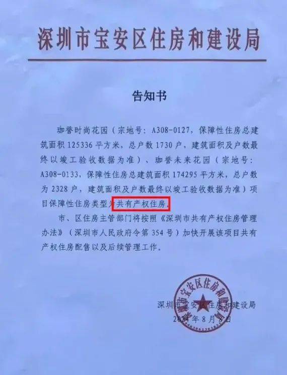 今年8月,宝安住建局发布告知书,明确鸿荣源珈誉府的2328户保障房的住房类型为“共有产权住房”。