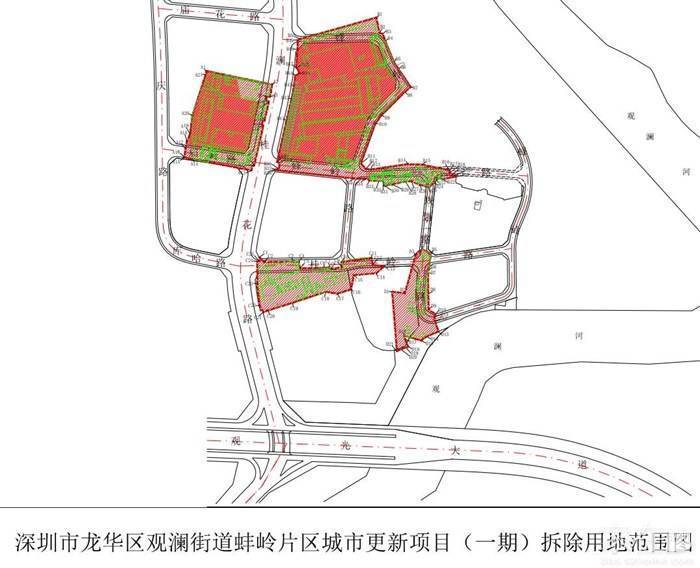 观澜街道蚌岭片区城市更新单元位于观澜北的蚌岭新村片区,处于城市干道观光大道与桂花路交汇处的东北侧。