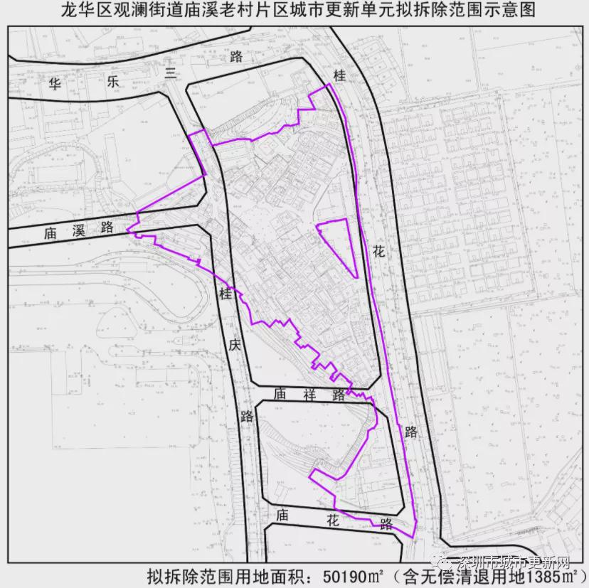 庙溪老村片区城市更新单元位于龙华区观澜街道,桂福路与桂花路交汇处的西南侧。该城市更新单元拟拆除范围面积为50190㎡(含无偿清退用地1385㎡),拟更新方向为居住、普通工业等功能。