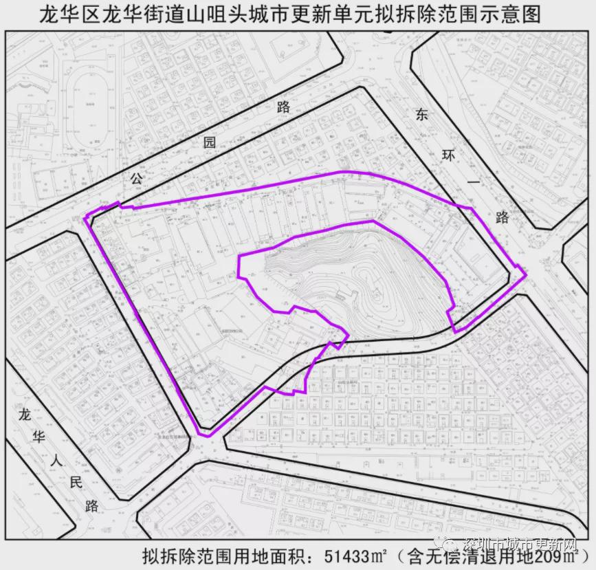 山咀头城市更新单元位于龙华街道东环一路与三联路交汇处西南侧,该城市更新单元拟拆除范围面积为51433㎡(含无偿清退用地209㎡)。拟更新方向为居住、商业功能。