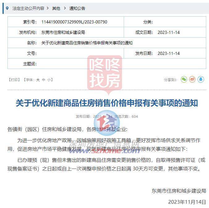 11月14日,东莞市住房和城乡建设局发布《关于优化新建商品住房销售价格申报有关事项的通知》(以下简称通知)。