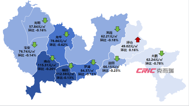 与之形成鲜明对比的是,除坪山区外,福田、南山、宝安、龙岗、龙华等多个核心区域的租金依旧呈现一致性环比“下跌”的态势。