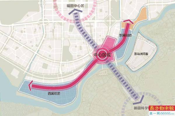 “两翼”:西翼包括福田保税区,规划建设高端科研区和中试转化基地;东翼包括皇岗口岸现状货检区及其东北侧生活区,规划建设国际协同创新区和国际人才社区。