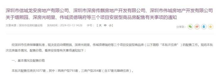 3月13日,深圳市住房保障署发布了缙熙园、深房光明里、伟城贤德瑞府等三个项目安居型商品房的配售通告。
