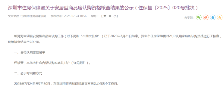 日前,深圳住建局公示安居房项目帆湾海寓的认购资格初审结果,合格入围家庭共18户。