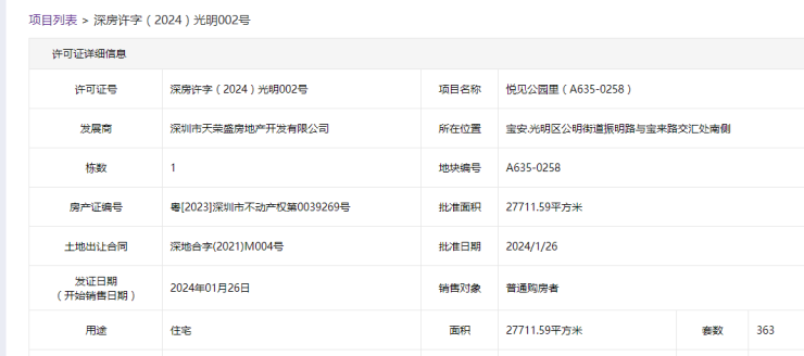 1月26日,深圳房地产信息平台公示悦见公园里363套住宅获批预售许可证。