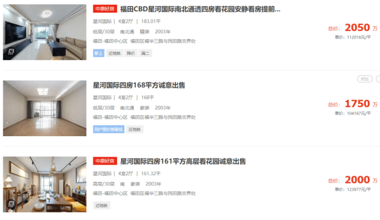 单价最低的是南山中心区的现代城华庭,建成于2004年,目前挂盘均价6.2万元/㎡,较新政前回落0.6%。