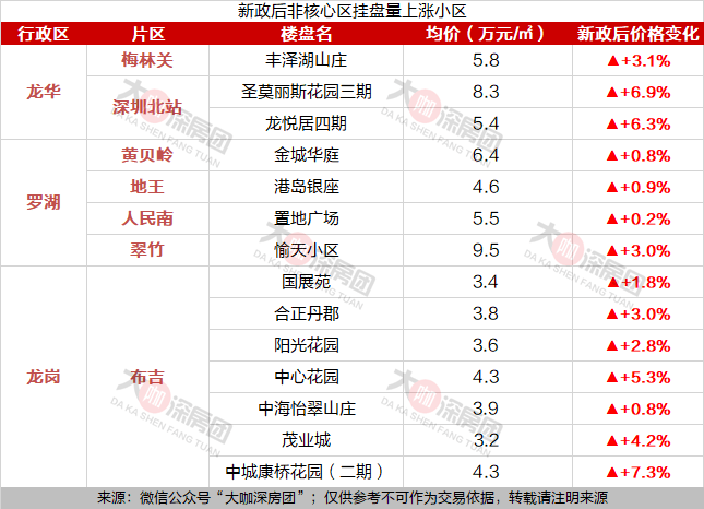 非核心区挂盘量上涨较高的主要集中在龙岗布吉片区,目前单价在3-4字头为主。
