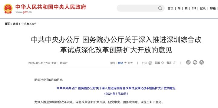 6月10日,中共中央办公厅、国务院办公厅印发《关于深入推进深圳综合改革试点深化改革创新扩大开放的意见》(下文简称《意见》)。