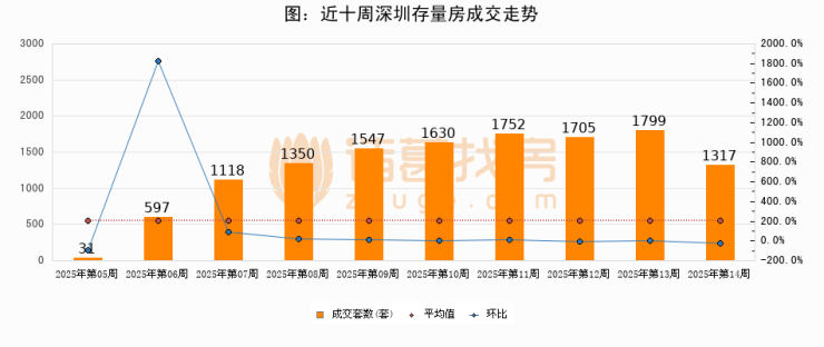 存量房方面,第14周深圳存量房成交1317套,较上周减少482套,环比下降26.8%。从近十周成交走势来看,周均成交套数为1284套,本周高于平均水平2.6%。