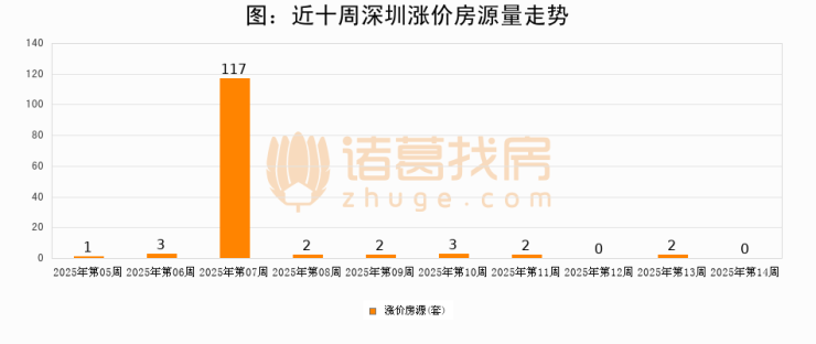 从调价房源来看,第14周深圳涨价房源0套,较上周下降100%。与此同时,14周涨价房源占比回落10.53个百分点,业主信心小幅波动,购房者可则需入市。