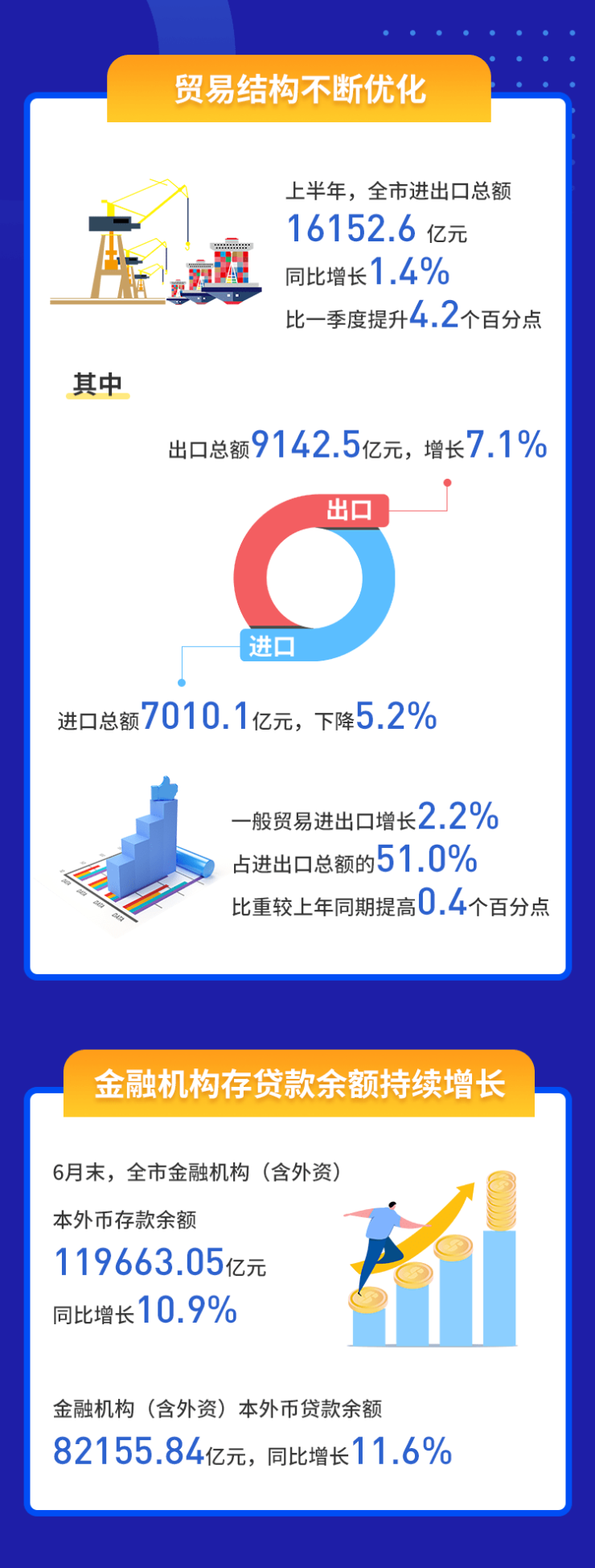 金融对实体经济支持力度不断加大。统计显示,6月末,全市金融机构(含外资)本外币存款余额119663.05亿元,同比增长10.9%。金融机构(含外资)本外币贷款余额82155.84亿元,同比增长11.6%。贷款余额增长高于存款余额,为实体经济带来资金活水。