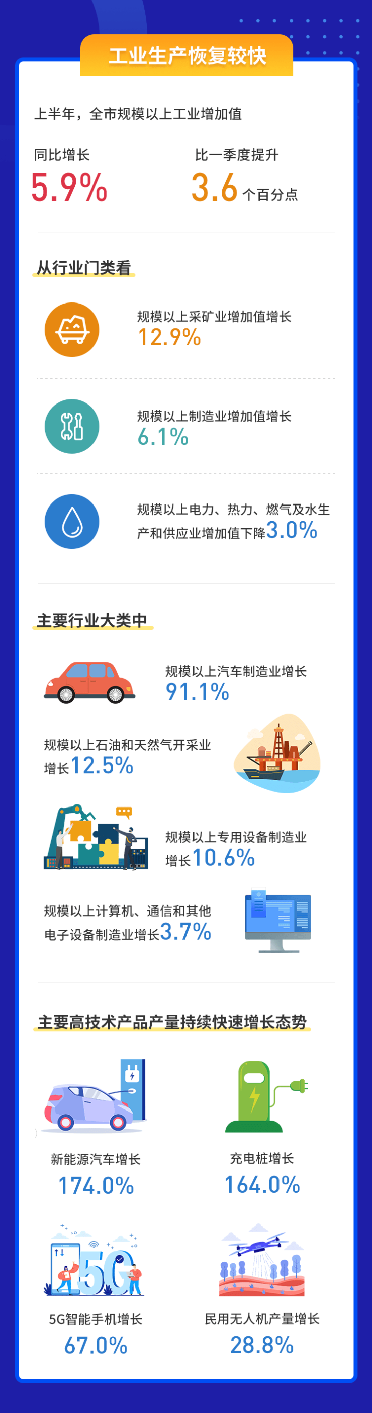主要高技术产品产量持续快速增长态势,其中,新能源汽车、充电桩、5G智能手机、民用无人机产量分别增长174.0%、164.0%、67.0%、28.8%。