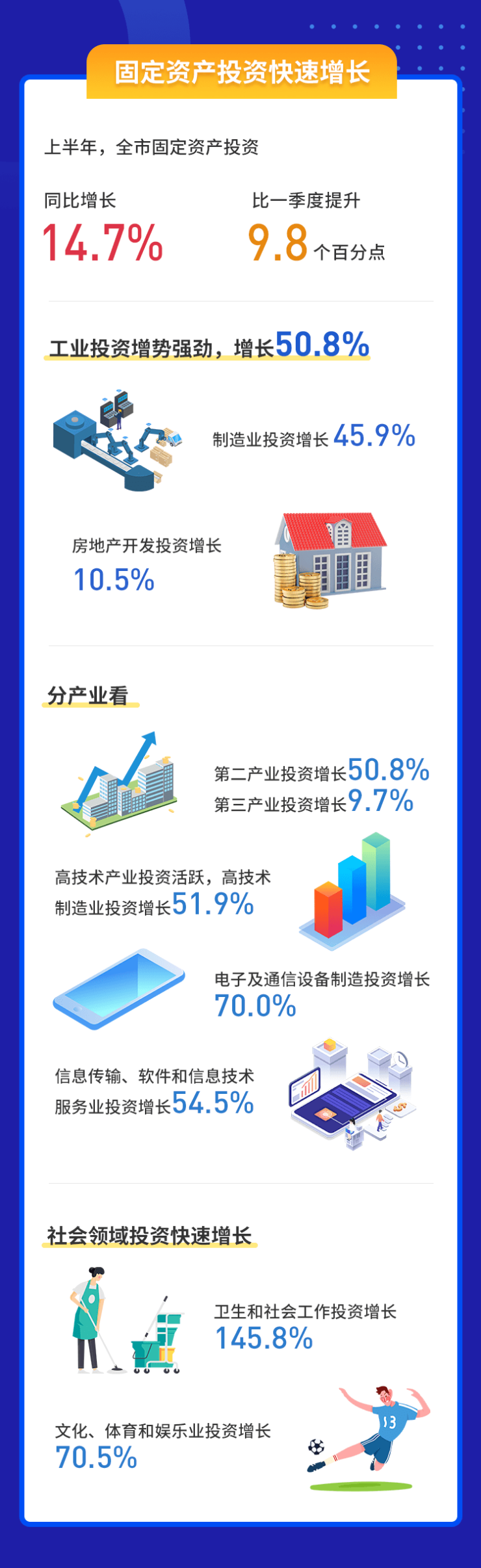分产业看,第二产业投资增长50.8%,第三产业投资增长9.7%。高技术产业投资活跃,高技术制造业投资增长51.9%,其中,电子及通信设备制造投资增长70.0%;信息传输、软件和信息技术服务业投资增长54.5%。