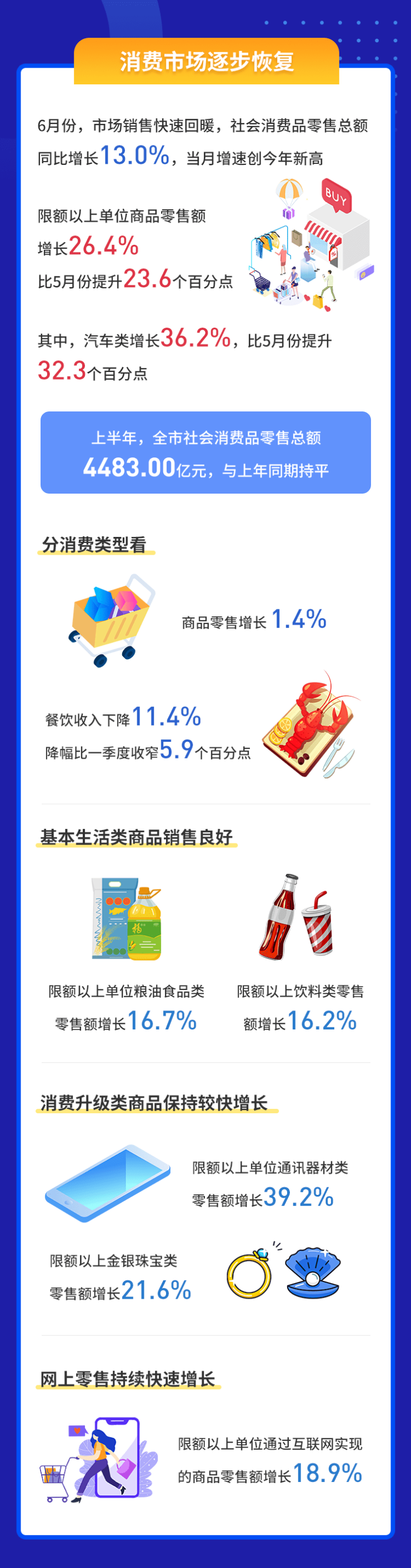 盘点上半年,全市社会消费品零售总额4483.00亿元,与上年同期持平。分消费类型看,商品零售增长1.4%,餐饮收入下降11.4%,降幅比一季度收窄5.9个百分点。