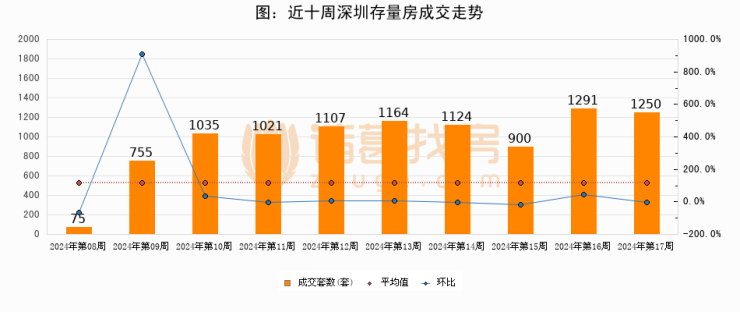 存量房方面,第16周深圳存量房成交1250套,较上周减少41套,环比下降3.2%。从近十周成交走势来看,周均成交套数为972套,本周高于平均水平28.6%。